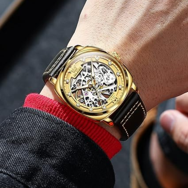 ⌚ Caja: Acero inoxidable de alta resistencia 🪞 Cristal: Hardlex resistente a los arañazos 🐂 Correa: Cuero genuino de alta calidad 🌙 Función: Luminosa en la oscuridad 🪶 Estilo: Steampunk / Lujo clásico ⚙️ Movimiento: Automático y manual